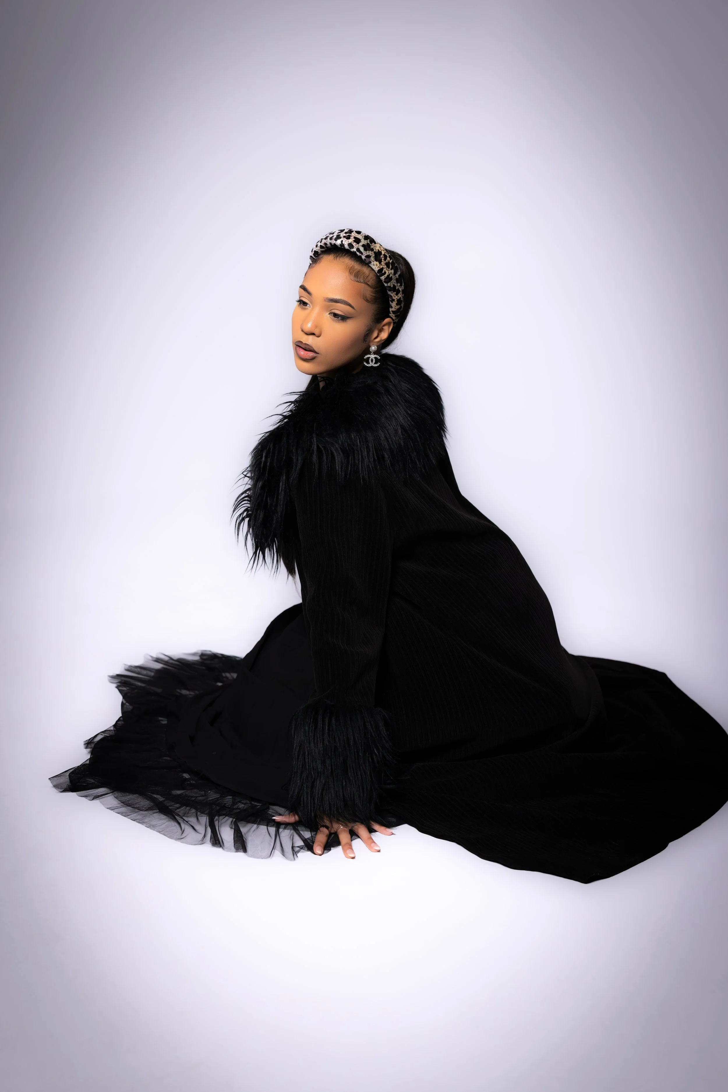 A woman dressed in a black outfit with fur accents, sitting on the floor with her legs folded underneath her, against a plain gray background. View fullsize