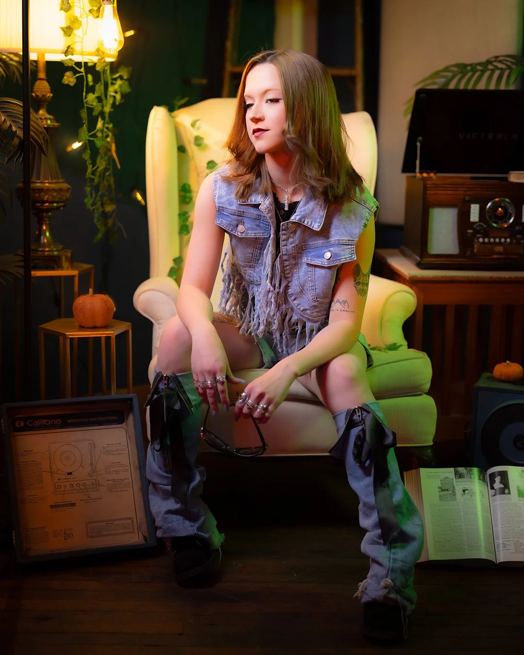 A young woman with red hair sitting in a vintage-style room with warm lighting. She wears a sleeveless denim vest, jean shorts, and is holding glasses. The room has plants, a cream-colored armchair, a record player on a wooden table, and books.