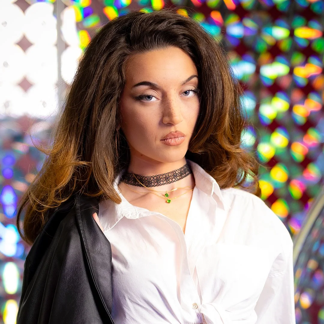 A woman with brown hair in loose waves poses with one arm raised and eyes closed, wearing a white crop top, light jeans, a black belt, layered necklaces, large hoop earrings, and a black jacket draped over her shoulder, against a colorful holographic