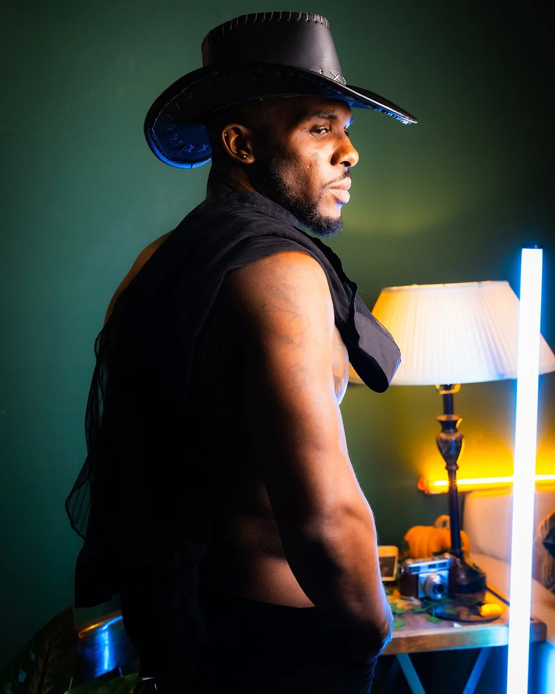 A man wearing a black cowboy hat and sleeveless shirt standing in a room with a green wall, illuminated by a table lamp and neon lights, with a camera on a table behind him. View fullsize
